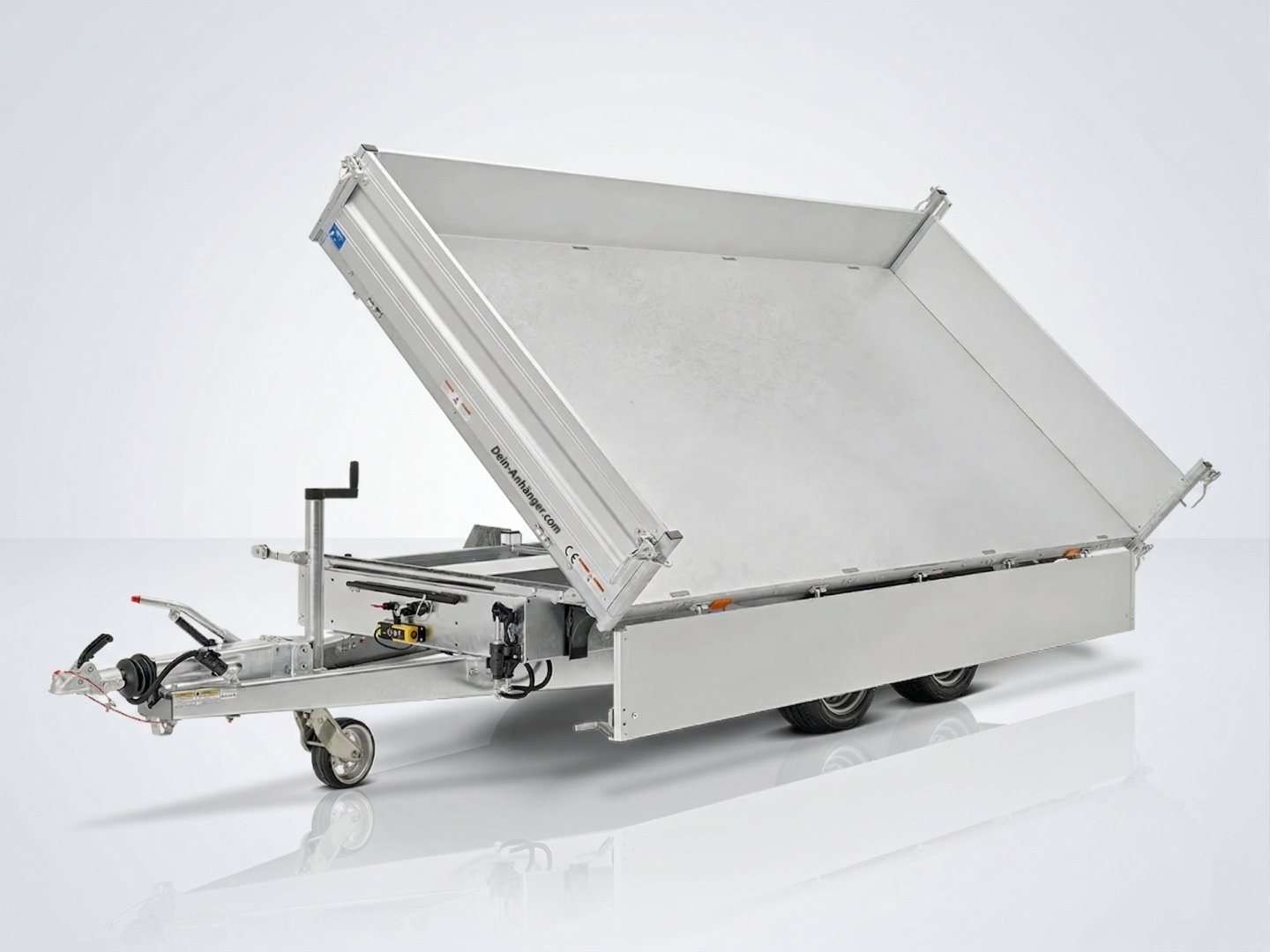 Eloxierte Aluminium-Bordwände (35 cm hoch): Die Bordwände sind nicht nur optisch ein Highlight, sondern auch hochgradig korrosionsbeständig. Alle vier Seiten lassen sich bequem abklappen oder komplett abnehmen – ideal für die seitliche Beladung mit dem Gabelstapler.