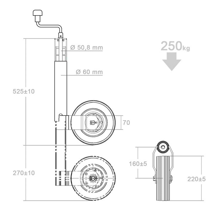 KARTT Stützrad Ø60mm 300kg 60mm 225x65mm Länge 525+270mm Ausdrehbar Premium Version
