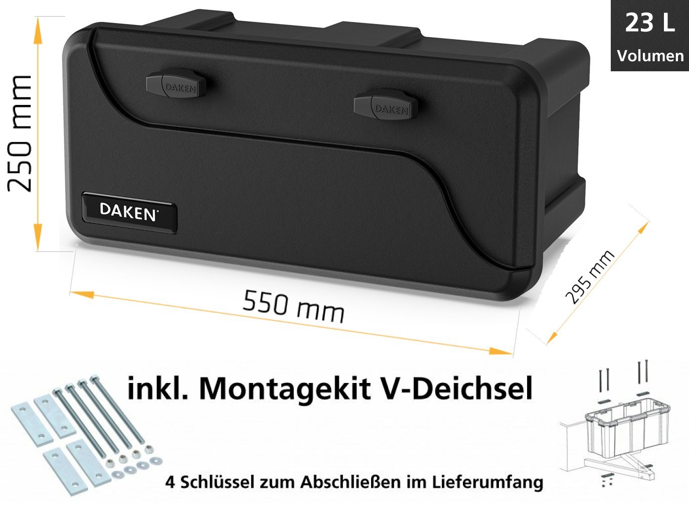 Blackit 2, Deichselbox mit Schloss, 550x250x295 LxBxH Werkzeugkasten, Gurtkiste, Just Daken B23-2 inkl. Montagekit