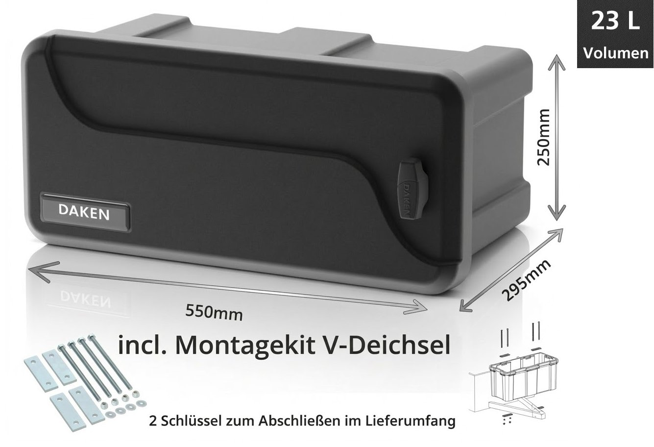 Blackit 1, Deichselbox mit Schloss, 550x250x295 LxBxH Werkzeugkasten, Gurtkiste, Just Daken B23-1 inkl. Montagekit